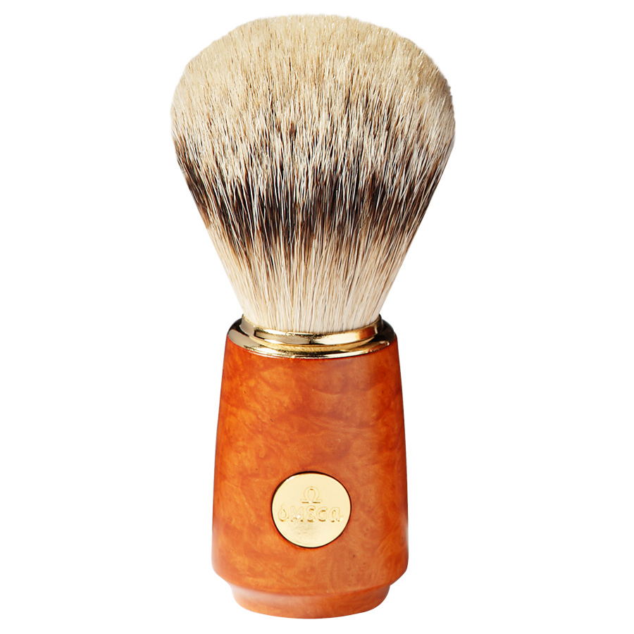 Omega Silvertip Badger shaving brush, briar wood handle, golden metal logo.